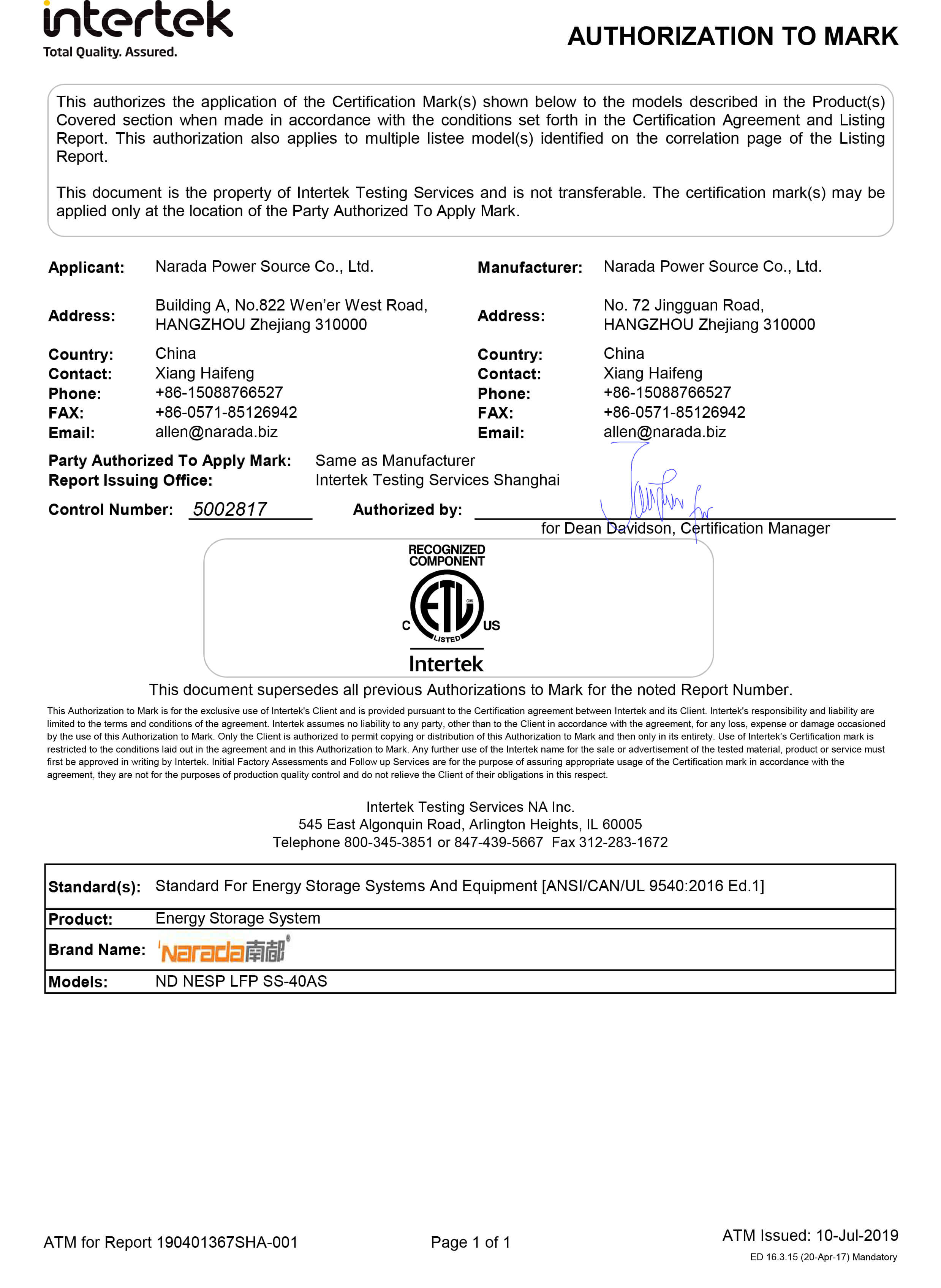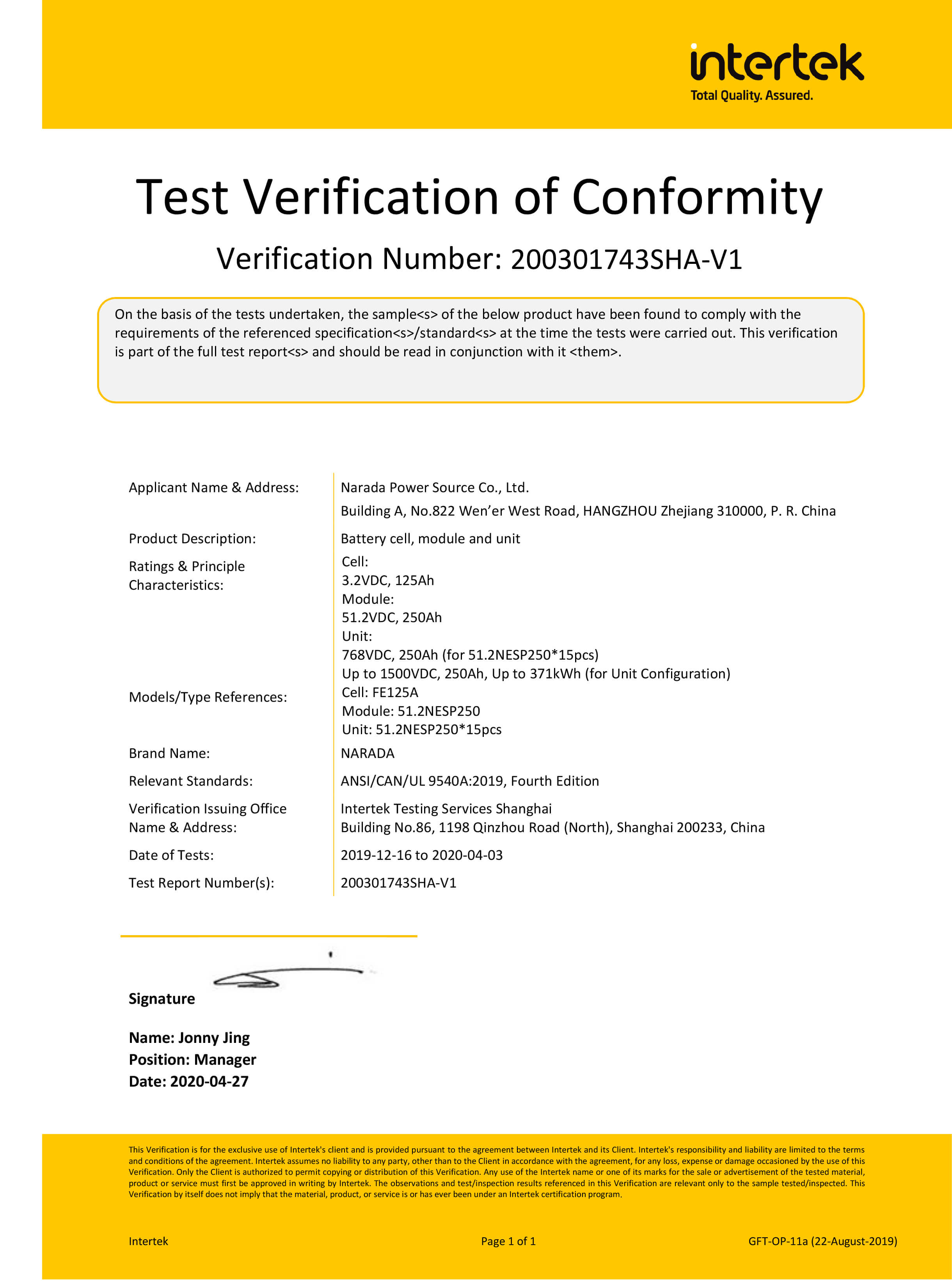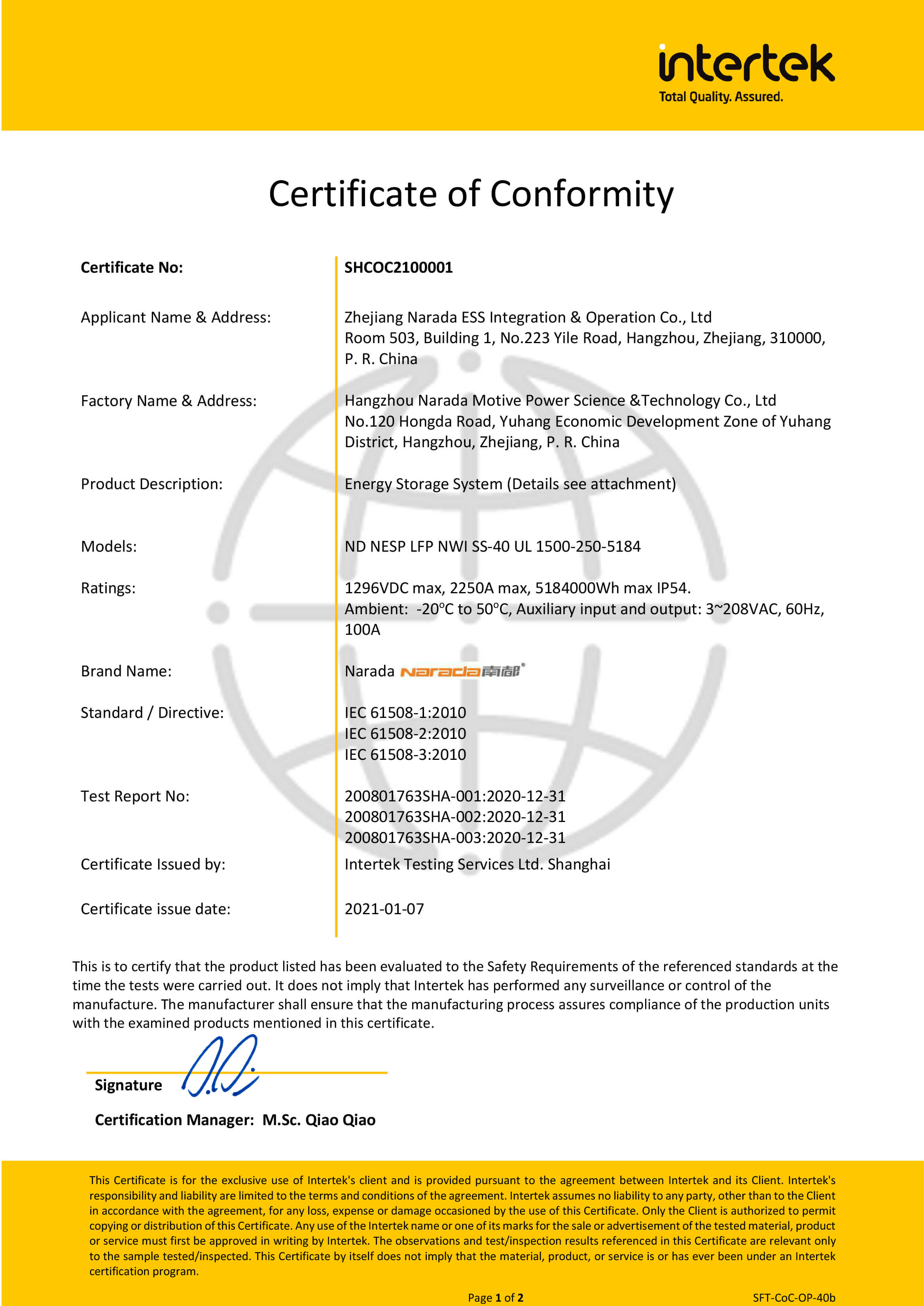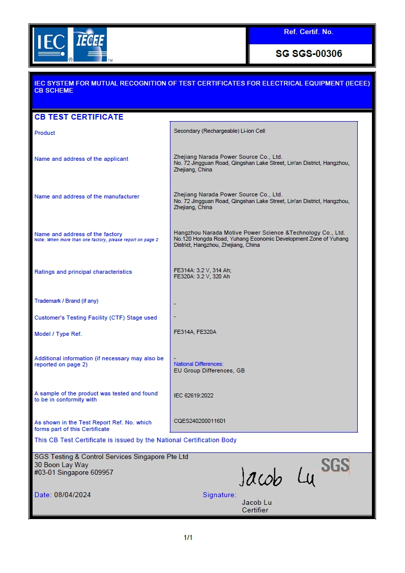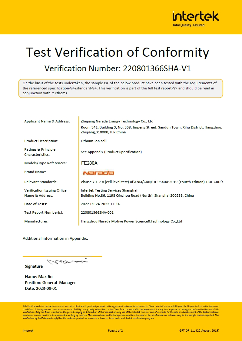 Narada is one of the first batch of enterprises in the world to pass UL9540 certification of MW class container energy storage system. Passing UL9540 certification means that Narada will have excellent global recognition.